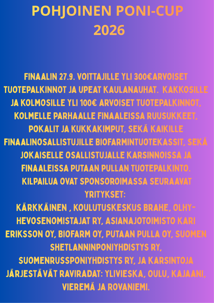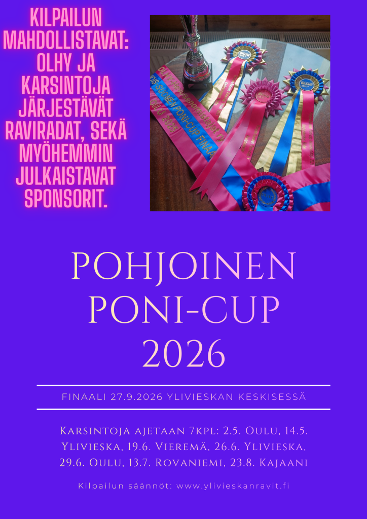 Pohjoisen Poni Cupin järjestää OLHY-Hevosenomistajat ry yhdessä yhteistyöratojen kanssa seuraavilla paikkakunnilla: